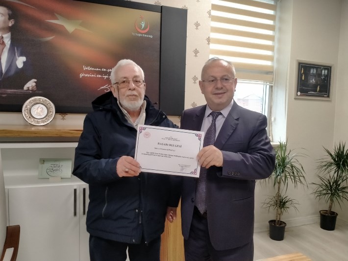 Başarı Belgesi için Sağlık Müdürlüğünde düzenlenen programda Süleyman Kösoğlu(69), Recep Bilgin (65) ve Abdullah Sevimli (66)’ye belgelerini Sağlık Müdür Yardımcısı Opr. Dr. Talip Başak verdi. Opr.Dr. Talip Başak yaptığı konuşmada’’ insan vücuduna birçok zararı olan sigarayı bırakan büyüklerimiz teşekkür ediyoruz. Müdürlüğümüzdeki Sigara Bırakma Polikliniğinde sigara içicileri ikna ve ilaç yoluyla bırakmalarına yardımcı olunuyor. Bu konuda ekip olarak başarılıda oluyoruz. Bugün bu üç büyüğümüz Sigara bırakma Polikliniğimize başvurarak 50 yıldır tiryaki oldukları sigaradan uygulanan tedavi ile 90 günde sigara bıraktılar. Kendilerini tebrik ediyorum. Bu konuda çalışanlarımız her zaman yardımcı olmaktadır. Bırakmak için önce kafada sigarayı bırakmaya karar vermek lazım’’ dedi.