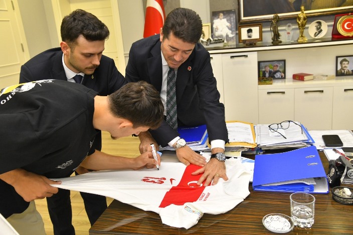 Trabzonspor altyapısından yetişen ve Hollanda’nın Ajax takımında forma giyen milli futbolcu Ahmetcan Kaplan, aynı zamanda Boztepe Mahallesi Muhtarı da olan babası Yücel Kaplan’la birlikte Başkan Kaya’yı ziyaret etti. Milli futbolcu, Almanya’da düzenlenen Euro 2024 Avrupa Futbol Şampiyonası son 16 turunda oynanan Avusturya maçında giydiği formayı imzalayarak Başkan Kaya’ya hediye etti.