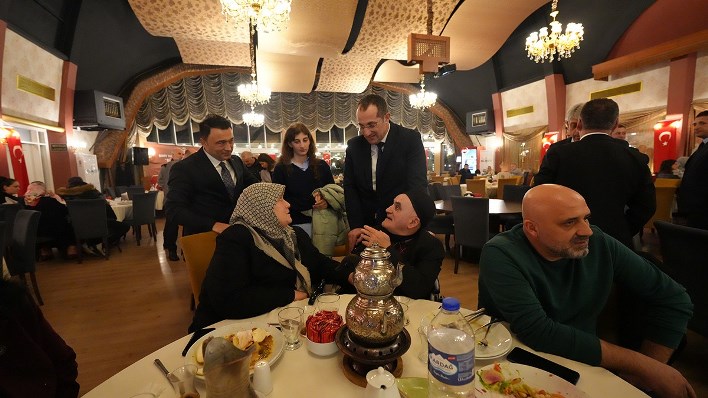 Kaymakam Cankatar, Başkan Ekim, ve protokol üyeleri masaları tek tek gezerek şehit yakınları ve gazilerle yakından ilgilendi, sohbet etti.