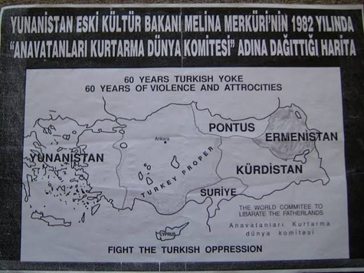 1982 yılında Yunanistan Kültür Bakanı Melina Merküri, “Anavatan Pontus’u Kurtarma Dünya Komitesi” adına bir harita dağıttı. Bu haritada, Trabzon merkezli Karadeniz bölgesi toprakları Pontus Rumlarına, Kalan Anadolu toprakları ise Ermeni, Süryani ve Kürtlere paylaştırılıyordu. Bu harita Yunan ders kitaplarına konulmuş olup, halen Yunanlı öğrencilere okutularak, onlarda Pontusçuluk şuuru geliştiriliyor…