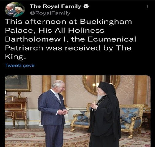 26 Ekim 2022 tarihinde İstanbul Fatih Kaymakamlığına bağlı, Aya Yorgi kilisesinde papazlık yapan Bartholomeos, yeni İngiliz Kralı tarafından da Ekümenik ifadesi ile karşılanmıştır.