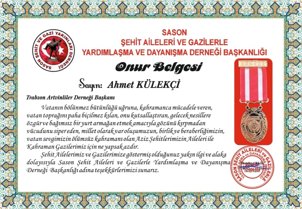 "kardeşlik projeleri ve gönül köprüleri kapsamında yaptığı çalışmalar ve sonrasında da her türlü diyalogların sağlanması noktasında gösterdiği özverili gayretlerden dolayı Trabzon Artvinliler Derneği Başkanı Ahmet Külekçi'ye ve Derneğine "Onur Belgesi" takdim edildi..
