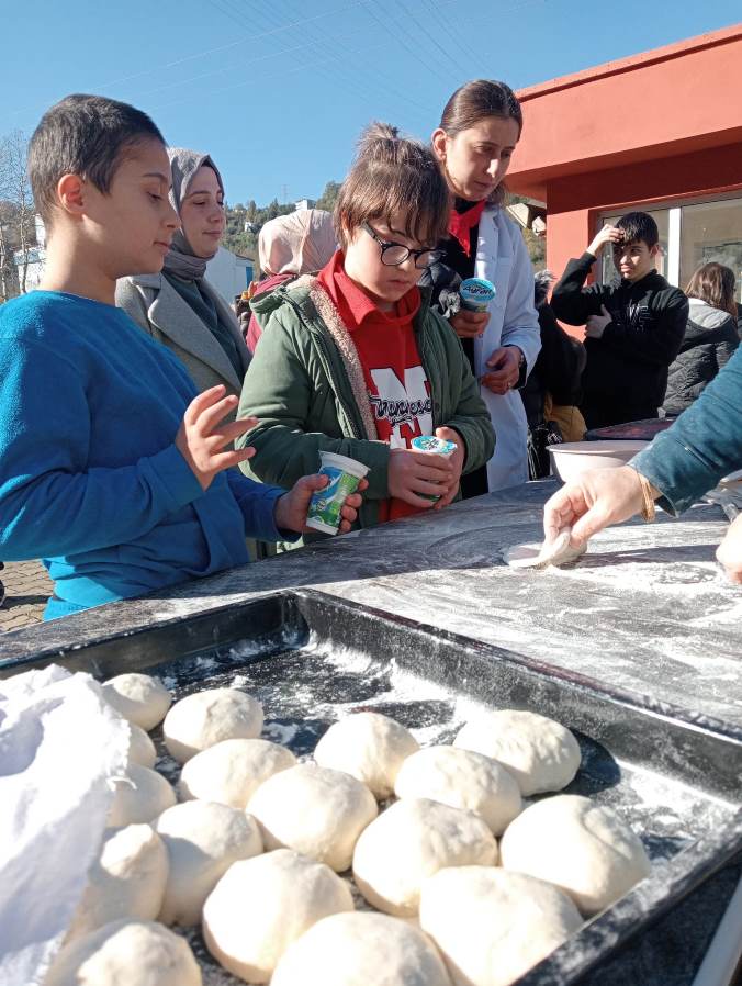 Okul bahçesinde kurmuş oldukları masalarda gözlemeler açan dernek üyeleri çocuklara, öğretmenlere ve misafirlere gözleme ayran ikramında bulundu.