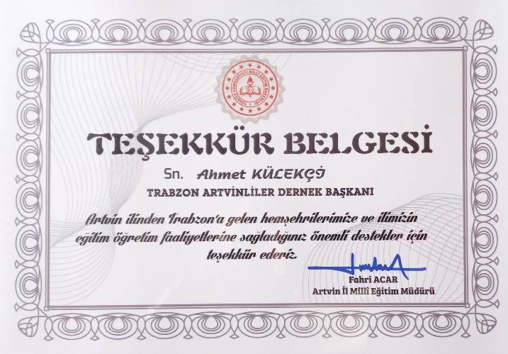 Trabzon Artvinliler Derneğinin çok anlamlı güzel hizmetleri olduğunu dile getiren Artvin İl Milli Eğitim Müdürü Fahri Acar dernek başkanı Ahmet Külekçi'ye "Artvin ilinden gelen hemşehrilerine ve ilin eğitim öğretim faaliyetlerine sağladığı desteklerden" dolayı teşekkür belgesi verdi.