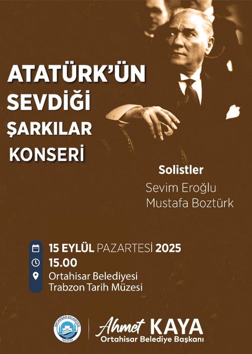 Programda daha sonra, Atatürk’ün Sevdiği Şarkılar Konseri düzenlenecek. Ortahisar Belediyesi Trabzon Tarih Müzesi’nde saat 15.00’te başlayacak konserde, solistler Sevim Eroğlu ve Mustafa Boztürk, Atatürk’ün sevdiği unutulmaz şarkıları seslendirecek.