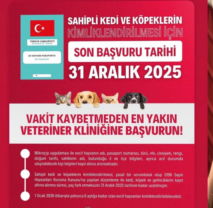 Yılın son haftasına girilirken, hayvan sahiplerinim vakit kaybetmeden en yakın Veteriner Kliniklerine başvurmalarını belirten Başkan SAYIN sözlerine şöyle devam etti; sahipli kedi ve köpeklerin kimliklendirilmesi yasal bir sorumluluk olup, 5199 sayılı Hayvanları Koruma Kanununda yapılan düzenleme ile kedi ve köpeklerin kayıt altına süresi yaş farketmeksizin 31 Aralık 2025 tarihine kadar uzatılmıştır.