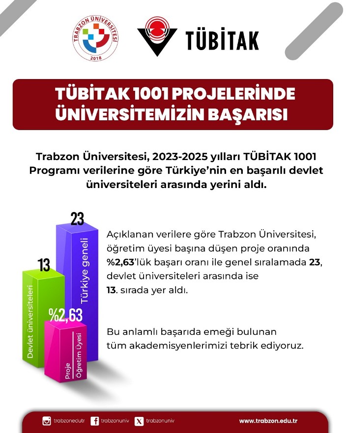 2023–2025 TÜBİTAK 1001 Programı verilerine göre; Üniversite öğretim üyesi başına düşen proje oranında yüzde 2,63’lük başarıyla Türkiye genelinde 23; devlet üniversiteleri arasında ise 13. sırada yer almayı başardı.
