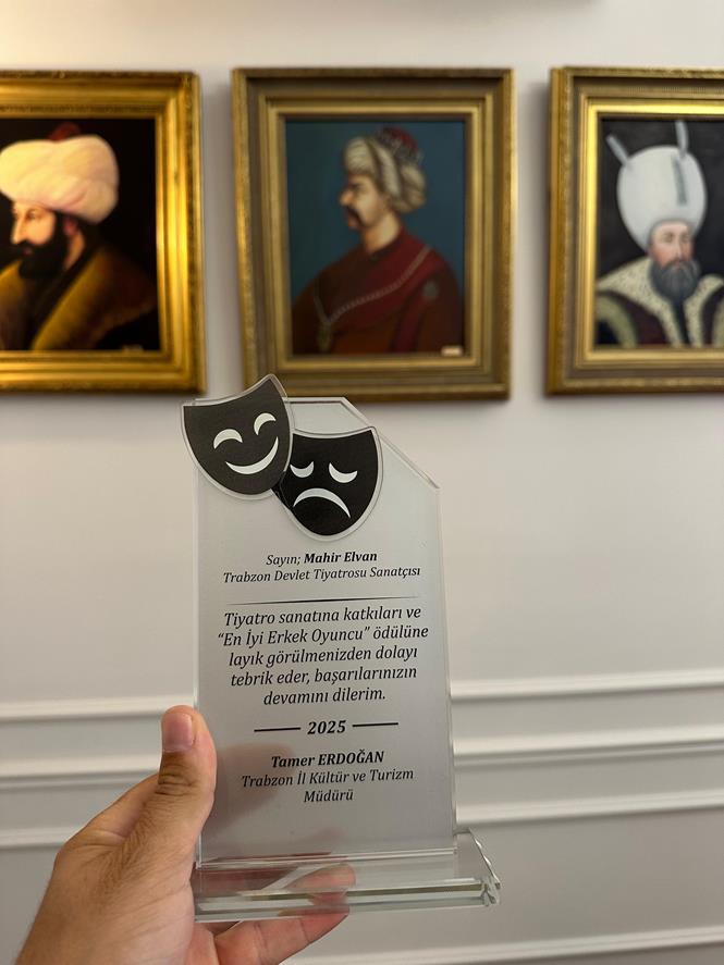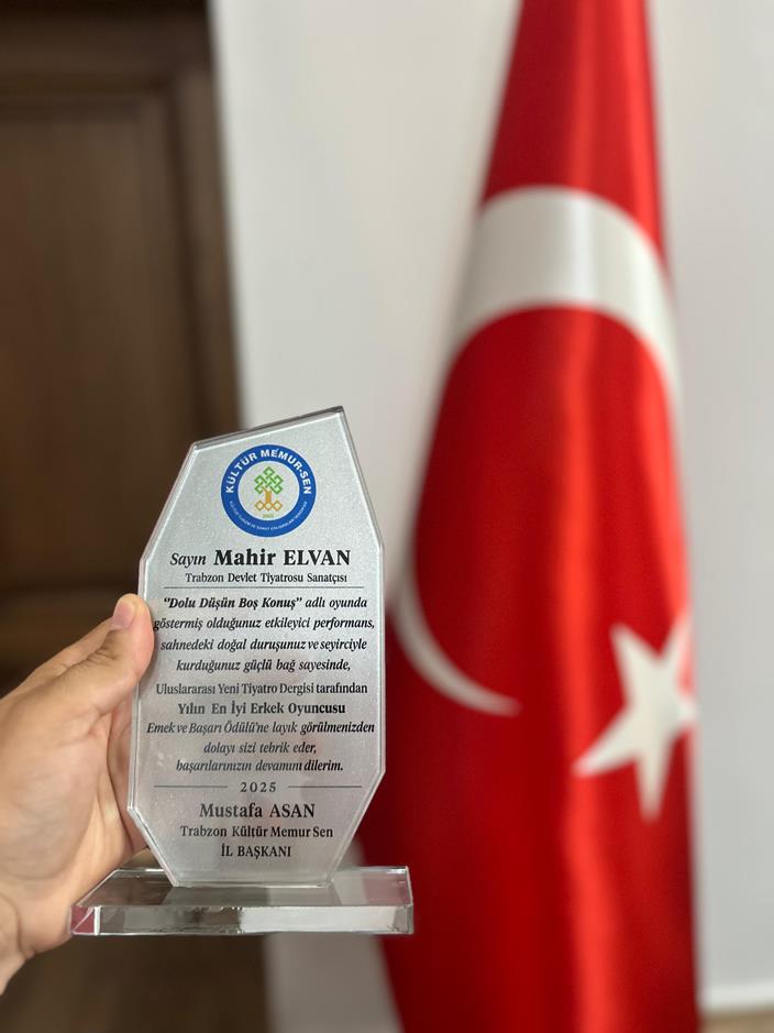 Kültür Memur-Sen Trabzon İl Temsilciliği tarafından takdim edilen plaket, Elvan’ın ulusal çapta kazandığı “En İyi Erkek Oyuncu” ödülü ve sahne dışında gösterdiği toplumsal duruşun bir nişanesi olarak sunuldu. Plaketi, Kültür Memur-Sen Trabzon İl Temsilcisi Sayın Mustafa Asan takdim etti.