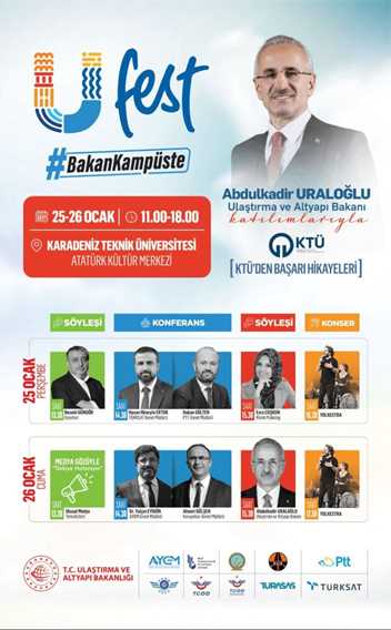 Bakan Uraloğlu, ‘U fest’ etkinliğine mezun olduğu okulda başlayacak. Karadeniz Teknik Üniversitesi İnşaat Mühendisliği bölümünden mezun olan Uraloğlu, Karadeniz Teknik Üniversitesi Atatürk Kültür Merkezi’nde 25-26 Ocak tarihlerinde düzenlenecek ‘U fest’ etkinliğinin ikinci gününde üniversite öğrencileriyle bir araya gelecek. Uraloğlu öğrencilerle sohbet edecek, bakanlık çalışmalarını anlatacak ve deneyimlerini paylaşacak.