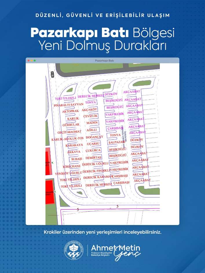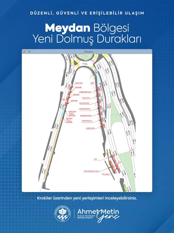 Trabzon Büyükşehir Belediyesi'nin şehir merkezindeki trafik yoğunluğunu azaltmak ve toplu ulaşımı daha düzenli hale getirmek amacıyla hazırladığı yeni dolmuş düzenlemesi uygulanmaya başladı. Yeni düzenlemeyle birlikte Meydan bölgesinde Yenicuma, Boztepe, Aydınlıkevler, Yeşiltepe, Kuran Kursu, Değirmendere, Yenimahalle, Çağlayan, KTÜ, Havalimanı ve Tıp Fakültesi dolmuşları eski Baro binası ile Fatih Parkı yanına konuşlandırıldı. Mumhaneönü bölgesinde ise Aydınlıkevler, Beşirli, Karşıyaka, Yeşiltepe, Yenimahalle, Bahçecik, Çamlık, Kuruçeşme, Çatak, Camiyanı ve Kuran Kursu dolmuş hatları, kendilerine ayrılan duraklarda hizmet vermeye başladı. Kalkış noktalarında sınırlı sayıda dolmuş bulunduruluyor ve dolup hareket eden aracın yerine depolama alanından yeni araç geliyor.