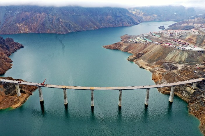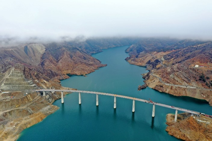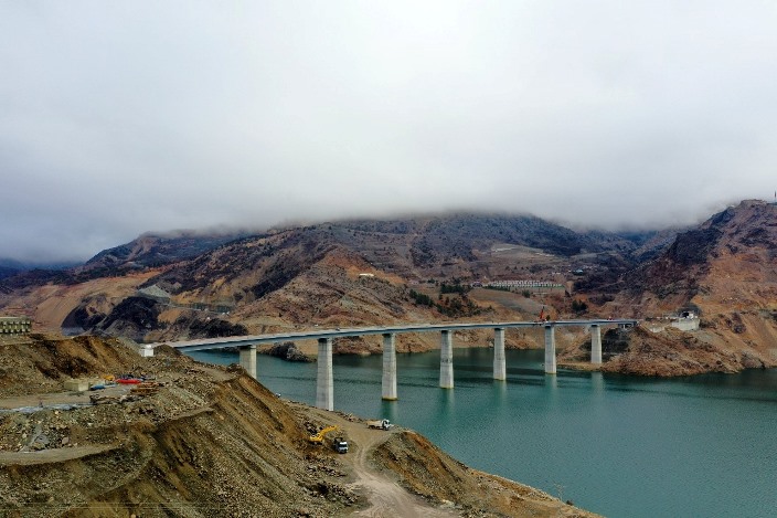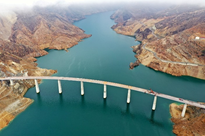 Yusufeli ilçesinde yeni ilçe merkezine ulaşımda önemli rol oynayacak olan merkez viyadüğünün de oldukça önemli olduğunu belirten Bakan Uraloğlu, “Yeni ilçe merkezini mevcut kara yoluna bağlayacak olan baraj gölü üzerinde 150 metre yüksekliğinde 685 metre uzunluğunda, dengeli konsol ve dökme sistemi kullanılarak inşa edilen viyadük için çalışmalarımız hızla sürüyordu. Çalışmalarda artık sona geldik.” İfadelerini kullandı.