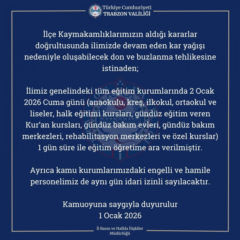 Valilikten yapılan açıklamada, 2 Ocak 2026 Cuma günü Trabzon genelindeki tüm eğitim kurumlarında eğitim-öğretime 1 gün süreyle ara verildiği bildirildi. Kararın; anaokulu, kreş, ilkokul, ortaokul ve liseler ile birlikte halk eğitimi kursları, gündüz eğitim veren Kur’an kursları, gündüz bakım evleri, gündüz bakım merkezleri, rehabilitasyon merkezleri ve özel kursları kapsadığı ifade edildi.