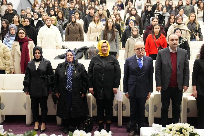 Ortahisar Belediyesi Temizlik İşleri Müdürlüğü personeli Gonca Ayhan, Avrasya Üniversitesi Sağlık Bilimleri Fakültesi Çocuk Gelişimi Programının katkılarıyla, 8 Mart Dünya Kadınlar Günü kapsamında düzenlenen “8 Mart Dünya Kadınlar Günü Etkinliği ve Sergisi” programına konuşmacı olarak katıldı. Ömer Yıldız Yerleşkesi Konferans Salonu’nda gerçekleştirilen etkinlikte, Sağlık Bilimleri Fakültesi Dekanı Prof. Dr. Yavuz Özoran, Sağlık Hizmetleri Meslek Yüksekokulu Müdürü Dr. Öğr. Üyesi Eren Ürtekin, öğretim görevlileri ve öğrenciler yer aldı. Katılımcılar, etkinlik öncesinde, 8 Mart Dünya Kadınlar Günü sergisini gezerek kadın emeğinin resmedildiği fotoğrafları inceledi.