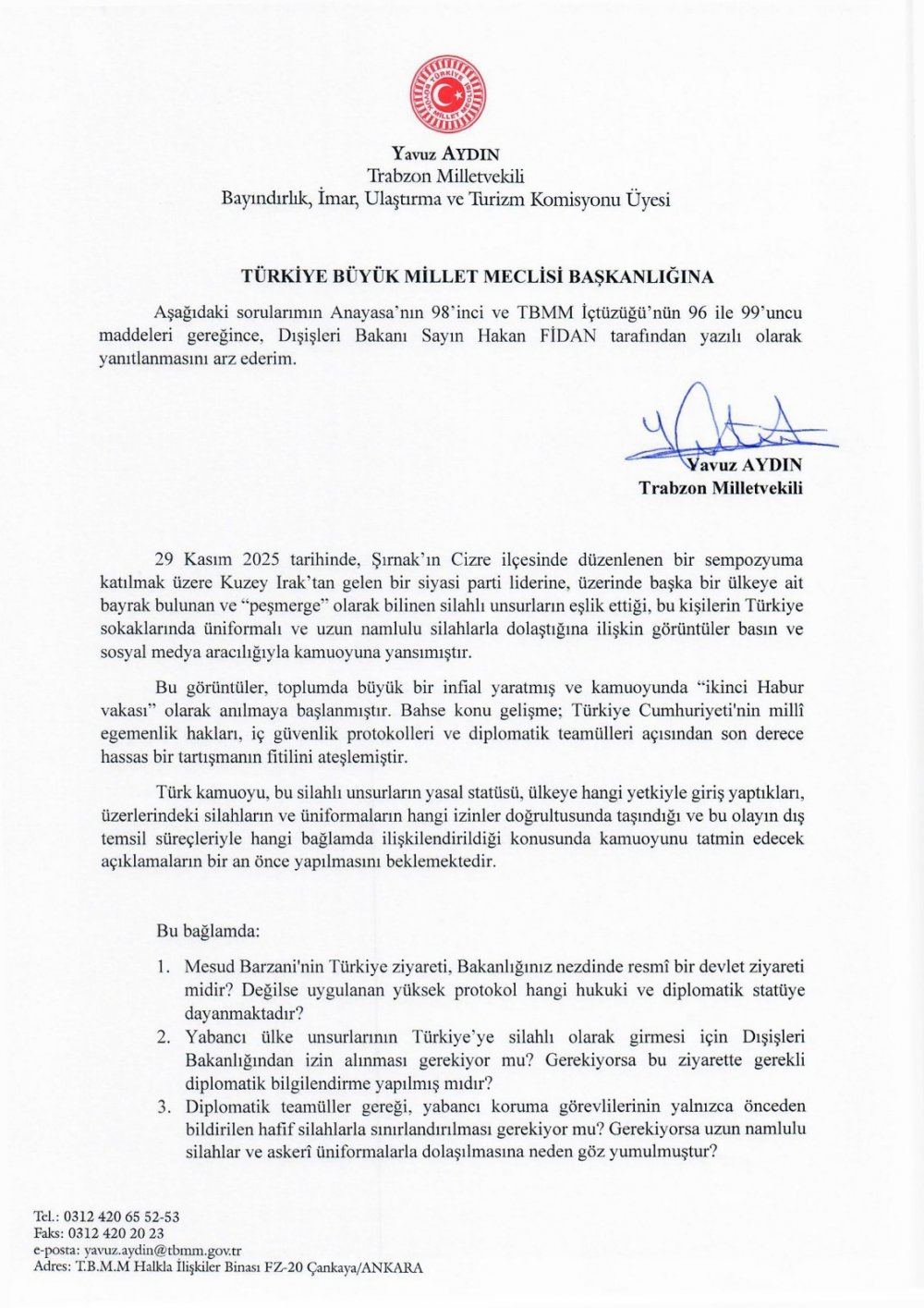 Aydın, bu durumun Türkiye’nin güvenliği, diplomatik teamüller ve Anayasa’nın egemenlik hükümleri açısından ciddi soru işaretleri doğurduğunu vurguladı.