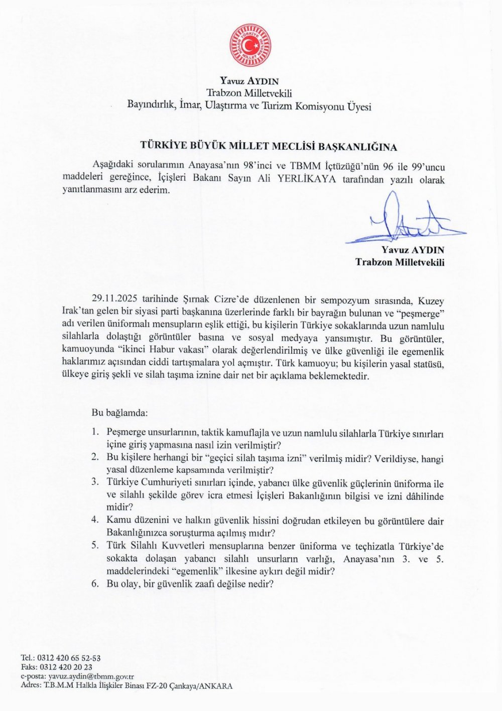 Aydın, olayla ilgili hem İçişleri Bakanı Ali Yerlikaya’ya hem de Dışişleri Bakanı Hakan Fidan’a ayrı ayrı soru önergeleri sunduğunu belirtti. Önergelerde şu sorular yer aldı: