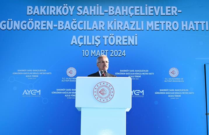 Ulaştırma ve Altyapı Bakanı Abdulkadir Uraloğlu, Cumhurbaşkanı Recep Tayyip Erdoğan'ın teşrifleri ile gerçekleştirilen Bakırköy Sahil-Bahçelievler-Güngören-Bağcılar Kirazlı Metro Hattı'nın açılış töreninde konuştu. Uraloğlu, iki hafta önce yaya odaklı Sirkeci-Kazlıçeşme Raylı Sistem Hattımızın ardından İstanbul’un en önemli kent içi ulaşım projelerden biri olan Bakırköy Sahil- Kirazlı hattının açılışını yaptıklarını anımsatarak, “İstanbul’u bir baştan diğer başa modern raylı sistem ağlarıyla donatmak için özveriyle hayata geçirdiğimiz projelerimize büyük bir hız kazandırdık” dedi.