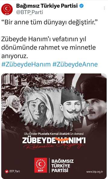 BTP’den yapılan açıklamada, “Bir anne tüm dünyayı değiştirir.” Zübeyde Hanım’ı vefatının yıl dönümünde rahmet ve minnetle anıyoruz” denildi.