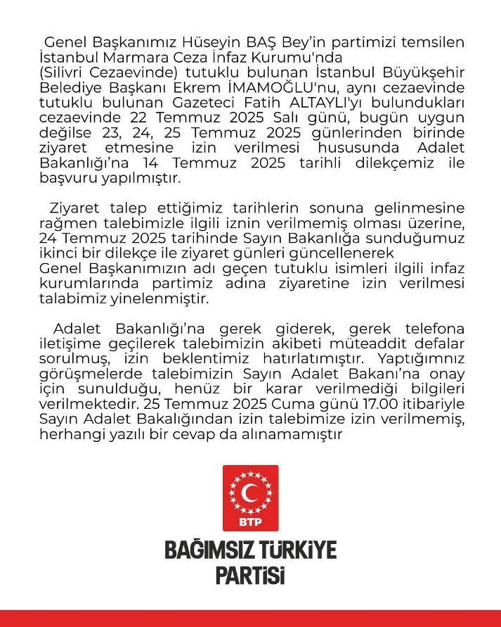 “Genel Başkanımız Hüseyin BAŞ Bey'in partimizi temsilen İstanbul Marmara Ceza İnfaz Kurumu'nda (Silivri Cezaevinde) tutuklu bulunan İstanbul Büyükşehir Belediye Başkanı Ekrem İMAMOĞLU'nu, aynı cezaevinde tutuklu bulunan Gazeteci Fatih ALTAYLI'yı bulundukları cezaevinde 22 Temmuz 2025 Salı günü, bugün uygun değilse 23, 24, 25 Temmuz 2025 günlerinden birinde ziyaret etmesine izin verilmesi hususunda Adalet Bakanlığı'na 14 Temmuz 2025 tarihli dilekçemiz ile başvuru yapılmıştır.