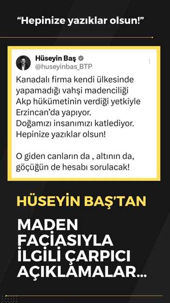 “Kanadalı firma kendi ülkesinde yapamadığı vahşi madenciliği AKP hükümetinin verdiği yetkiyle Erzincan’da yapıyor. Doğamızı insanımızı katlediyor. Hepinize yazıklar olsun! O giden canların da, altının da, göçüğün de hesabı sorulacak!