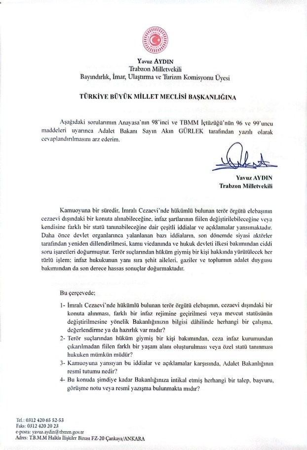 İYİ Parti Trabzon Milletvekili Yavuz Aydın, kamuoyunda yeniden tartışma konusu olan İmralı’da terörist başı Abdullah Öcalan’a yönelik konut iddialarını Türkiye Büyük Millet Meclisi gündemine taşıdı. Milletvekili Aydın, Adalet Bakanı Akın Gürlek ile İçişleri Bakanı Mustafa Çiftçi’nin yazılı olarak yanıtlaması istemiyle iki ayrı soru önergesi vererek, terör örgütü elebaşına cezaevi dışında farklı bir statü tanınabileceğine yönelik iddiaların açıklığa kavuşturulmasını istedi.