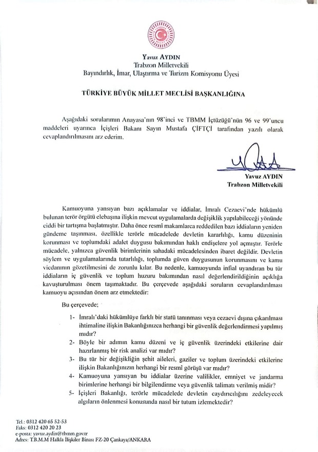 İçişleri Bakanlığına verilen soru önergesinde ise meselenin kamu düzeni, iç güvenlik ve toplum huzuru boyutu öne çıkarıldı. Yavuz Aydın, İmralı’daki hükümlüye farklı bir statü tanınması veya cezaevi dışına çıkarılması ihtimaline ilişkin herhangi bir güvenlik değerlendirmesi yapılıp yapılmadığını, böyle bir adımın kamu düzeni üzerindeki etkilerine dair hazırlanmış bir risk analizi bulunup bulunmadığını sordu. Aydın ayrıca, şehit aileleri, gaziler ve toplum üzerindeki muhtemel etkiler konusunda Bakanlığın resmî görüşünü, valilikler ile emniyet ve jandarma birimlerine bu konuda herhangi bir bilgilendirme ya da talimat verilip verilmediğini de gündeme getirdi.