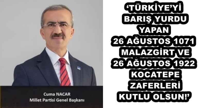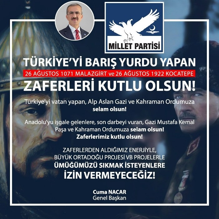 Anadolu’daki onlarca etnik ve dini grubu, 26 Ağustos 1071 Malazgirt zaferi ile, Doğu Roma İmparatorluğu’nun zulmünden kurtararak mutluluğa, huzura, barışa ve hürriyete kavuşturan ve Türkiye’yi vatan yapan, Alp Aslan Gazi’ye, Kahraman Ordumuza selam olsun! Zaferlerimiz kutlu olsun!
